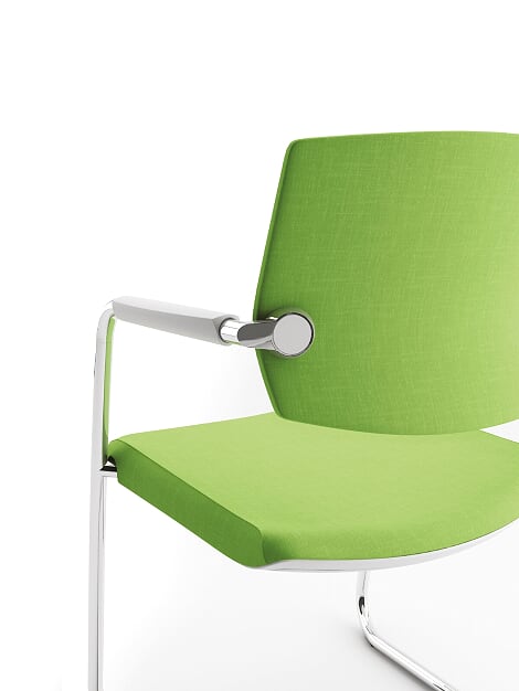 Подлокотники-накладки из пластика шириной 37мм имеют закругление с одного конца и скошенный край с другого, ближнего к спинке стула. Снизу вылита платформа, повторяющая форму трубы кантилевера, на которую ложится подлокотник. Крепится двумя винтами каждый. Шляпки винтов располагаются под трубой, проходят насквозь каркас и ввинчиваются в накладку.