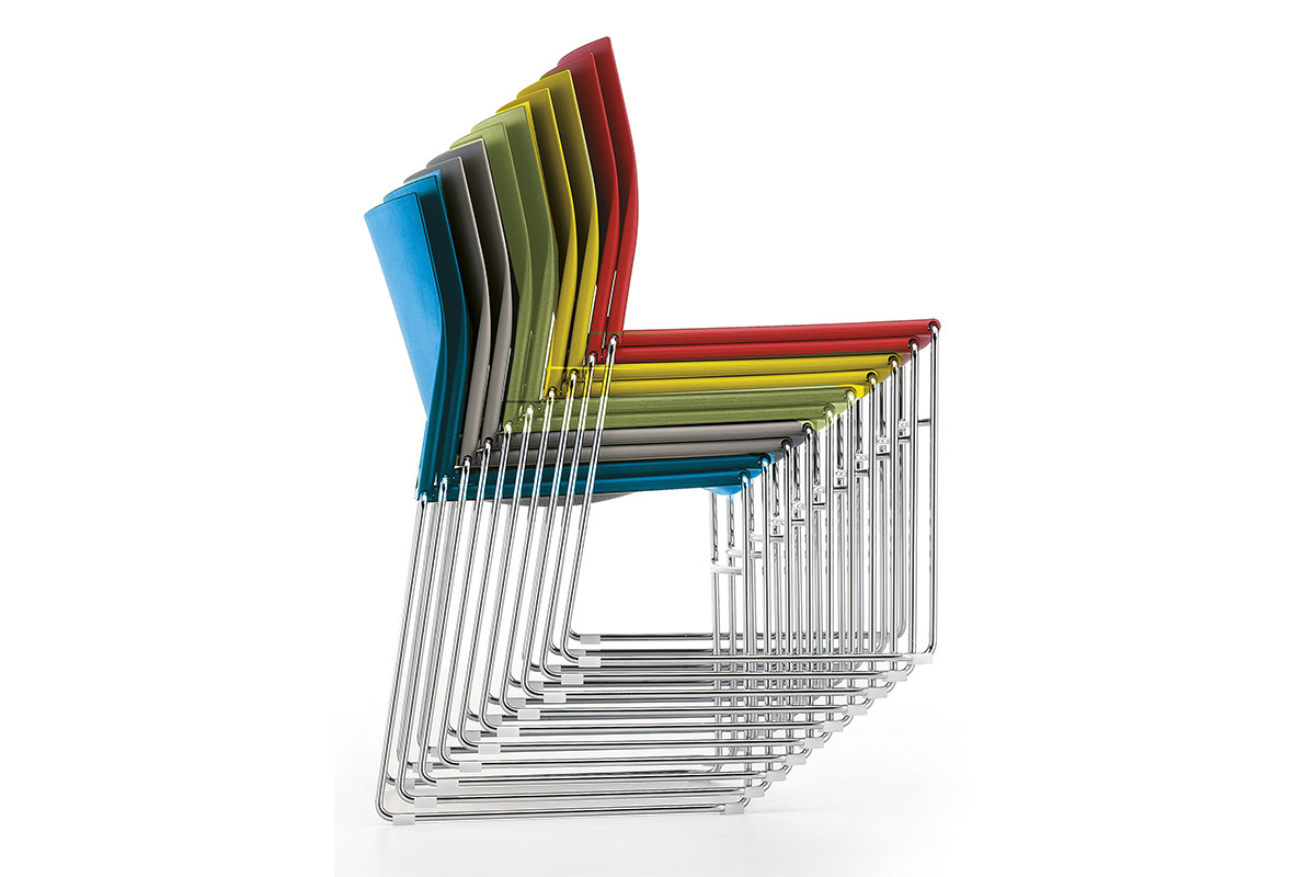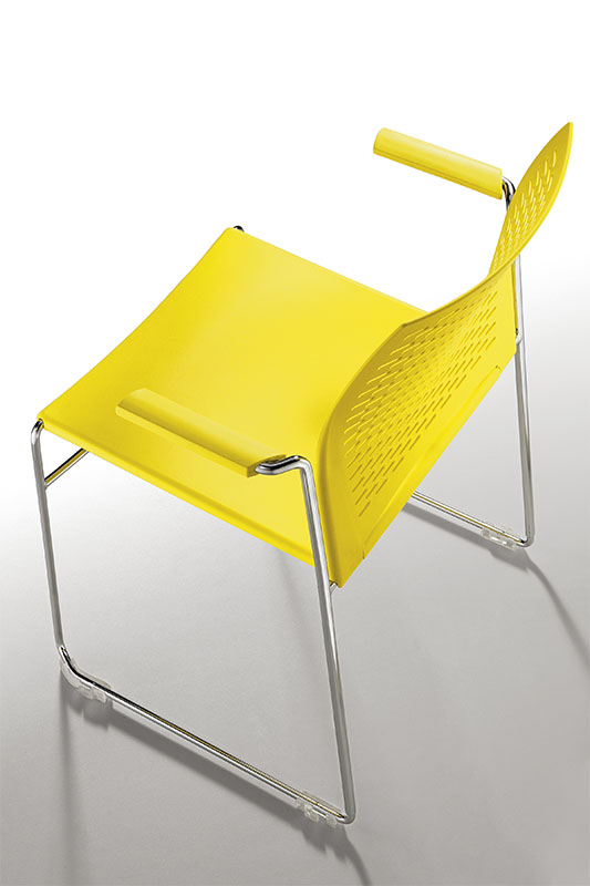 Сиденье и спинка из полипропилена. Сиденье фиксируется на каркасе с помощью подседельной крышки, которая крепится к сиденью 9-ю саморезами. Подседельная крышка закрывает нижнюю часть каркаса и защищает, при штабелировании, нижний стул от повреждений. Спинка надевается на штыри каркаса и фиксируется на нем специальными выступами сидения.