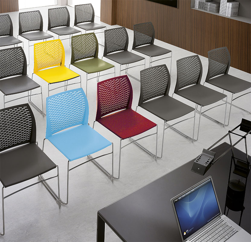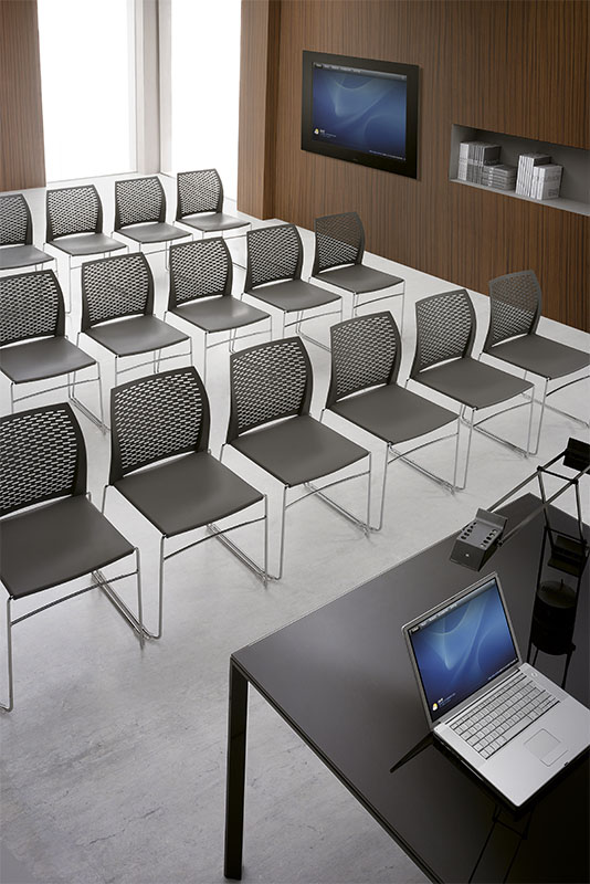 Данная модель позволяет оборудовать помещение для различных целей: конференция, круглых столов, обучений и других мероприятий.  Заложенные решения позволяют быстро трансформировать одну конфигурацию помещения в другую, необходимую в настоящий момент. Легко собираются в ряды с формированием проходов в удобных местах и произвольным расстояние между рядами. Можно установить пюпитр. Ряды легко и быстро разбираются. Для хранения и перемещения стульев имеется тележка, в которую можно поместить до 40 стульев.